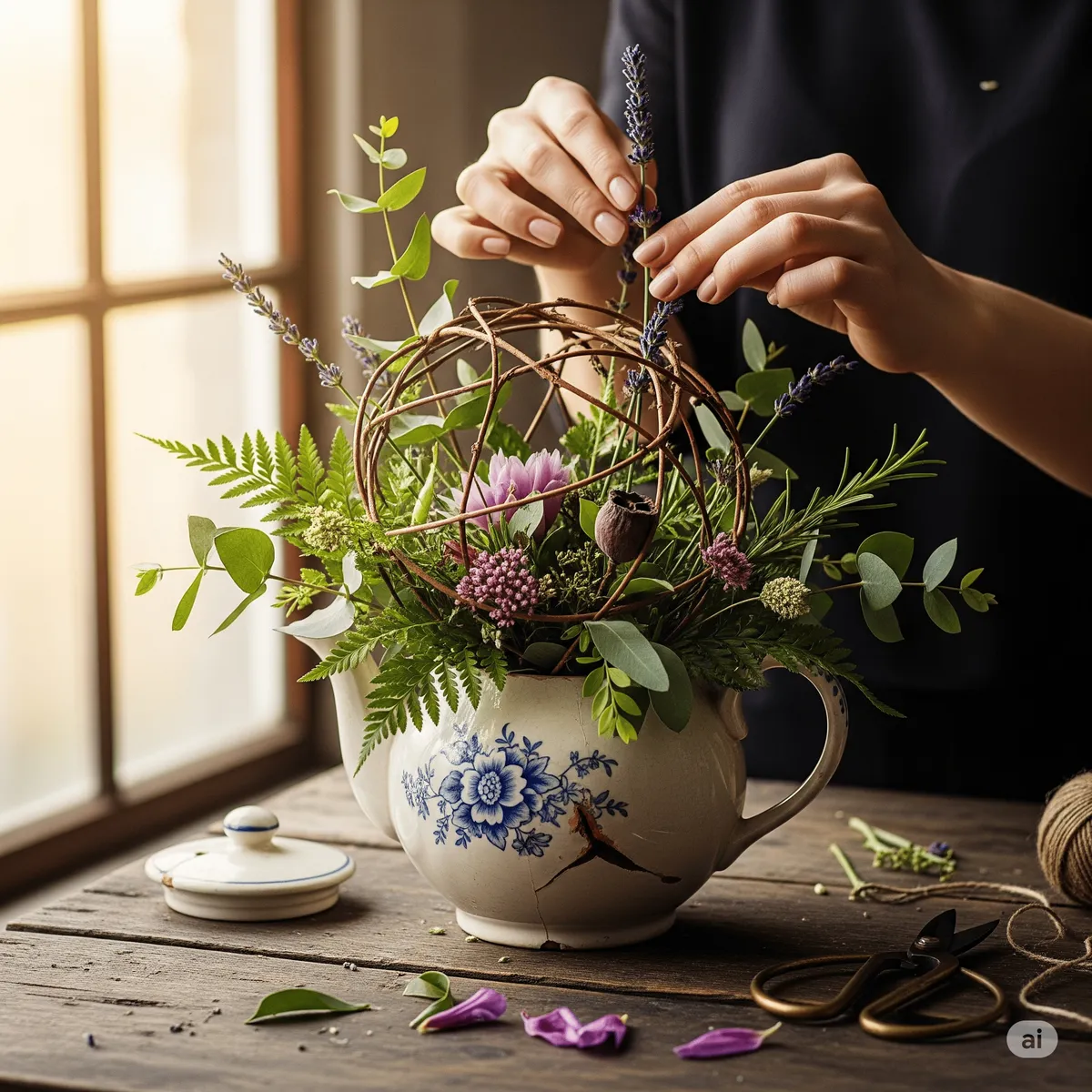 Olhe ao seu redor. Aquele bule de cerâmica antigo da sua avó, uma garrafa de vidro bonita, uma lata vintage ou até mesmo uma xícara de chá podem se transformar em vasos únicos e cheios de personalidade. Reutilizar e ressignificar objetos é uma forma poderosa de tornar sua Arte Floral ainda mais sustentável e pessoal. Antes de comprar um vaso novo, explore sua casa, brechós e feiras de antiguidades. Cada peça com história adiciona uma camada de profundidade e alma ao seu arranjo.